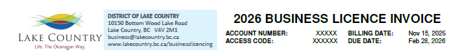 4. If you do not have a MyLakeCountry account your invoice and 2026 business licence (once payment is received) will be mailed via Canada Post. Due to Canada Post's rotating strikes, postal delivery times can vary so switching to e-billing is encouraged to ensure you receive your documents promptly.