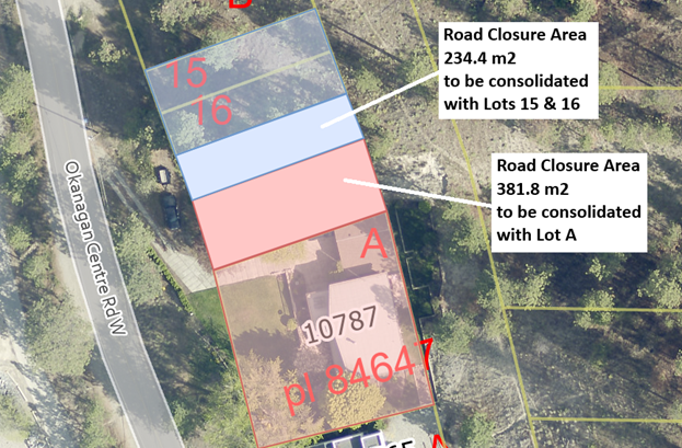 PROPERTY: The proposed road closure is shown on the map below to be consolidated with Lots 15 & 16 Block M and 10787 Okanagan Centre Road West.