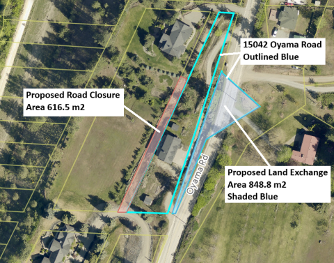 The District is proposing to close a portion of road located west of 15042 Oyama Road 616.5 meters squared in area. The District is proposing to trade the closed road to Kevin John Gouwenberg and Jennifer Lynn Gouwenberg to be consolidated with their existing property at 15042 Oyama Road in exchange for the eastern portion of their split parcel, 848.8 metres squared in area. The lands to be exchanged are considered equivalent in value.