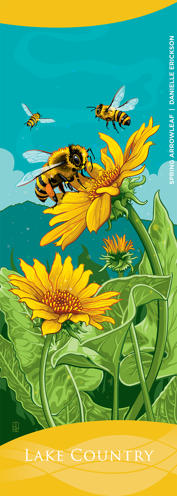 Image ![]() | Artwork title: Spring Arrowleaf Artist: Danielle Erickson Artist Statement: Arrowleaf Balsam Root blanket the slopes in Lake Country every spring. Their beautiful yellow flowers are a symbol of hope and renewal. Each one is like an individual burst of sunshine, waking me up after the long grey months of winter. The arrowleaf benefit the bees as well. Our vital pollinators highlight the delicate balance of nature. |
