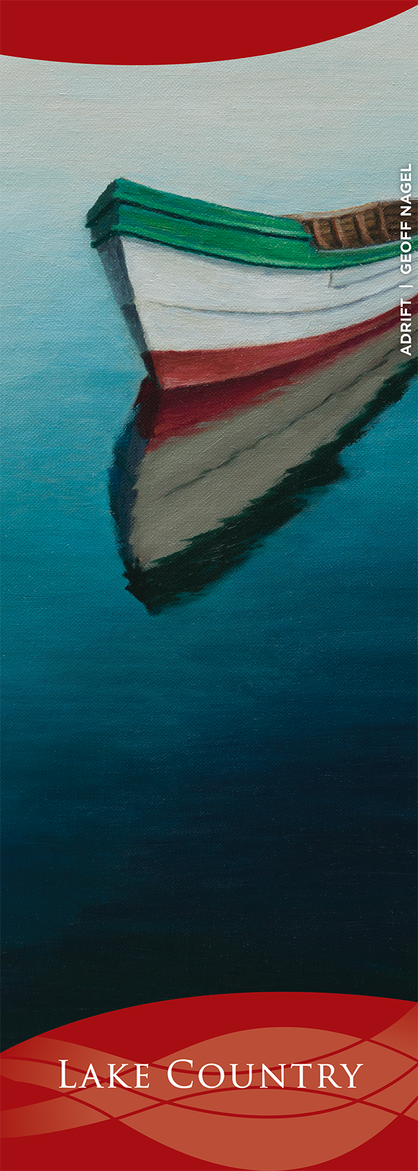 Image ![]() | Artwork title: Adrift Artist: Geoff Nagel Artist Statement: A boat drifts on still deep waters. Profound waters that entice you to explore their mysterious depths. Go ahead - jump in. After all.. we're in Lake Country. |