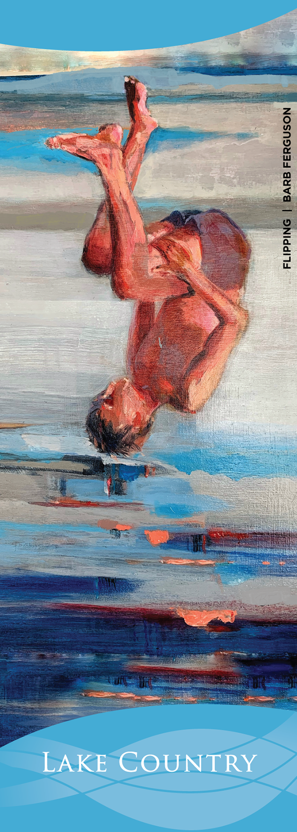 Image ![]() | Artwork title: Flipping Artist: Barb Ferguson Artist Statement: This is an original painting of what almost every kid loves to do in the Okanagan - flip off the dock or pier. I believe this banner would bring a smile to anyone's face because the colours are pure summer and the subject is so nostalgic. |