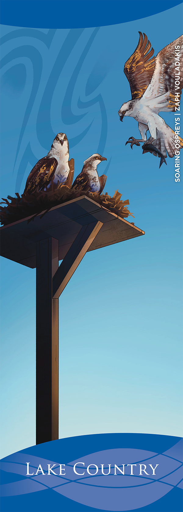 Image ![]() | Artwork title: Soaring Ospreys Artist: Zaph Vouladakis Artist Statement: This artwork depicts the ospreys living here in Lake Country. Watching the ospreys as I drive by their nest is one of my favourite parts of the day. I feel they are as much a part of Lake Country as the people living here. |
