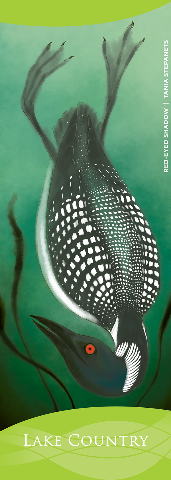 Image ![]() | Artwork title: Red-Eyed Shadow Artist: Tania Stepanets Artist Statement: Captured mid-dive, the loons form slips silently into the green depths-its red eye fixed, its body streamlined, vanishing into the still world below the surface. This piece is inspired by the tranquil lakes of Lake Country. Here becomes stillness and instinct becomes grace - a quiet reminder of the precision and mystery found within our local ecosystems. |