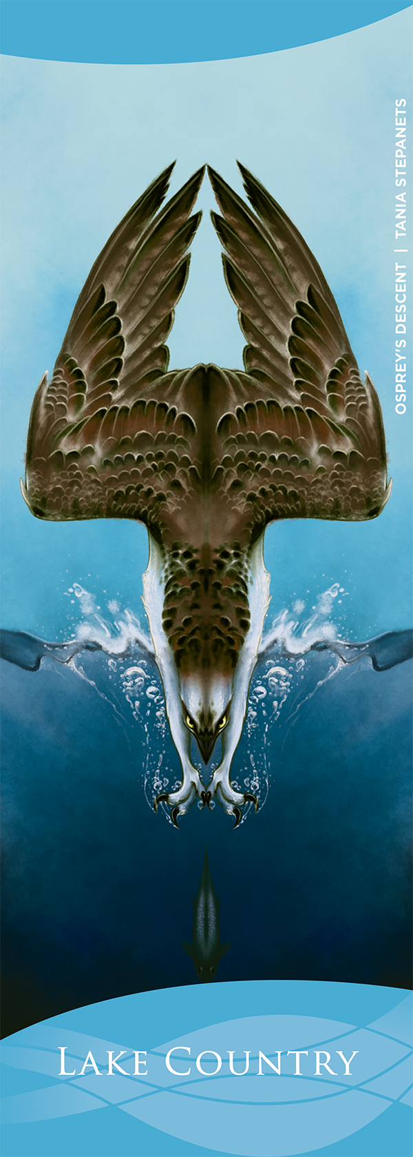 Image ![]() | Artwork title: Osprey's Descent Artist: Tania Stepanets Artist Statement: Inspired by the natural beauty and wildlife of Lake Country, British Columbia, "Osprey's Descent" captures the dramatic moment an osprey - a familiar presence across the region's lakes - dives with precision and intent. The symmetrical composition reflects the balance of predator and prey, sky and water, wild instinct and serene environment. Rooted in the rich biodiversity of the Okanagan Valley, this work invites viewers to reflect on the hidden intensity of nature that thrives just beyond our everyday view. |