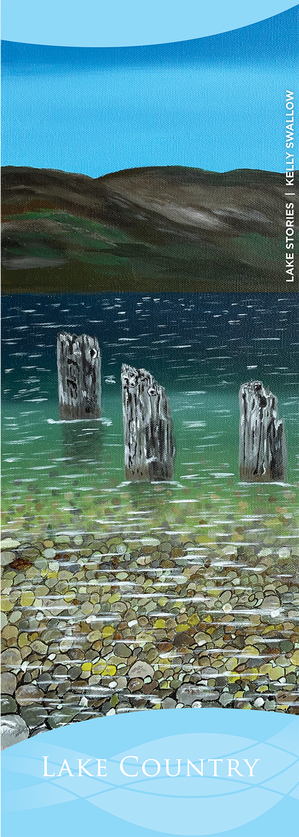 Image ![]() | Artwork title: Lake Stories Artwork: Kelly Swallow Artist Statement: This painting is inspired by a photo I took while walking along a path on Okanagan Lake. How lucky is this community to have such a beautiful lake just minutes away. These old pillars coming up out of the lake are a reminder of the history this lake holds. If it could talk I think there would be some amazing "Lake stories" |