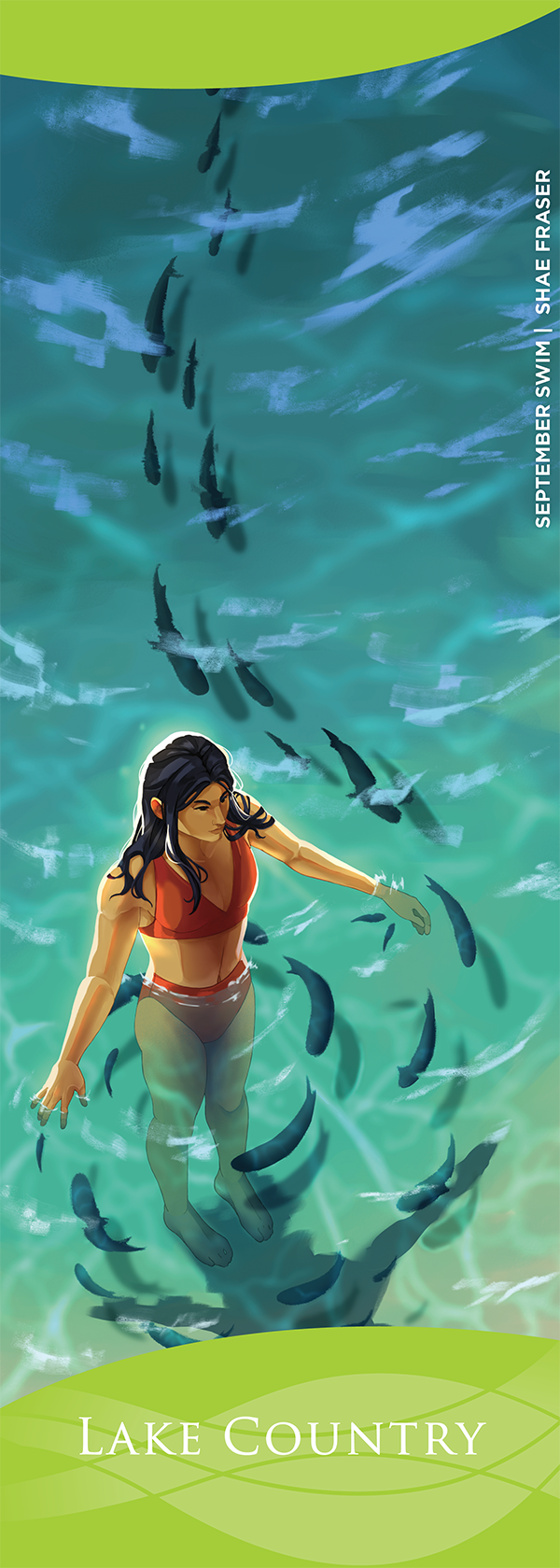 Image ![]() | Artwork title: September Swim Artist: Shae Fraser Artist Statement: This picture was inspired by one of my favourite recent lake memories (I've lived here 20 years so there is a LOT of them). It was the beginning of September, all the tourists had headed home and people were back in school. No one else had been swimming, so all the fish were getting brave and staying near the shore. They surrounded me totally without fear and it felt like being chosen as one of the shoal. There was no one else there but the minnows, the crows in the pines and I. September has become my favourite month to swim. When thinking about the core aspects of our community, you can't take the lake out of Lake Country. |