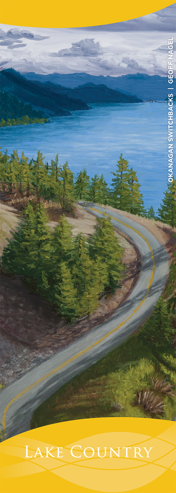 Image ![]() | Artwork title: Okanagan Switchbacks Artist: Geoff Nagel Artist Statement: Okanagan Centre Road West descends switchbacks on the slopes of Lake Okanagan on it's way to the shore. While the distant landscape rests in shadows from gathering clouds, the late afternoon sun basks this section of Lake Country casting long shadows across the road. |