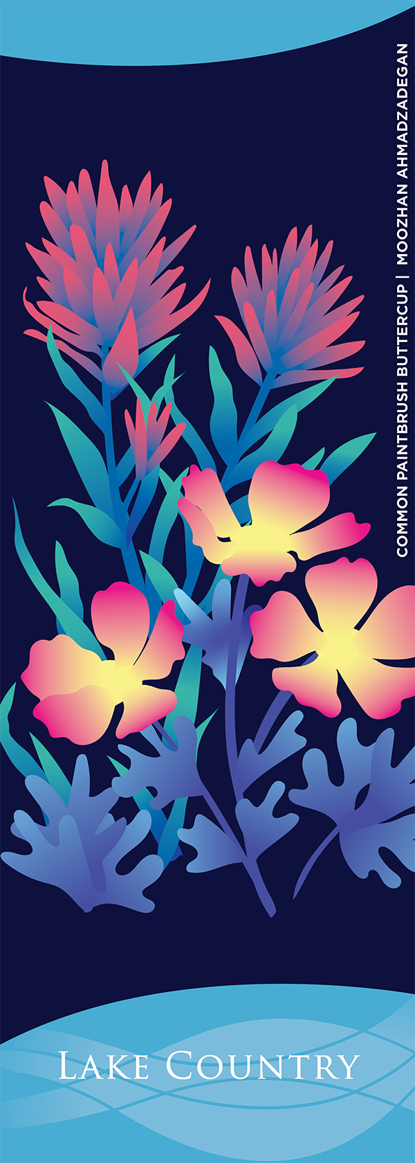 Image ![]() | Artwork title: Common Paintbrush Buttercup Artist: Moozhan Ahmadzadegan Artist Statement: I am a local artist and attempt to create work that engages themes of place and identity. This digital artwork is a stylized depiction of the Buttercup and Common Paintbrush flora, plants native to the Okanagan. |