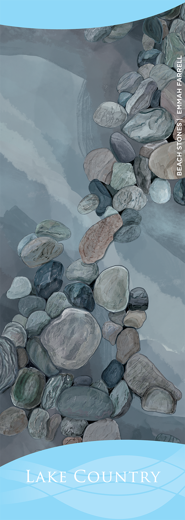 Image ![]() | Artwork title: Beach Stones Artist: Emmah Farrell Artist Statement: Beach Stones is inspired by my cherished memories of Lake Country during my time living in Kelowna. When I moved to the Okanagan in 2018, I first stayed in Lake Country, and one of the earliest places I visited with my family was a rocky beach along the lake. The abundance of stones scattered across the shoreline left a lasting impression on me. To this day, those beach stones remain a powerful symbol of my connection to the landscape, evoking the many peaceful moments I spent by the water throughout my years in the Okanagan. I see the stones as a uniquely defining feature of the Lake Country shoreline — one that I believe to be familiar to many who have spent time by the lake. |
