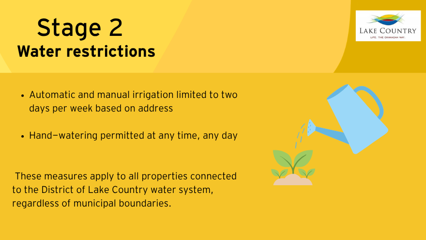 There are year-round, assigned day water conservation measures in place to help to reduce peaks in water use, reducing the high demands on our water delivery system at any given time. This allows the system to keep up with the demands for clean drinking water, irrigation and commercial use, and gives it the ability to store water for future use (ie. in case of local fires).
